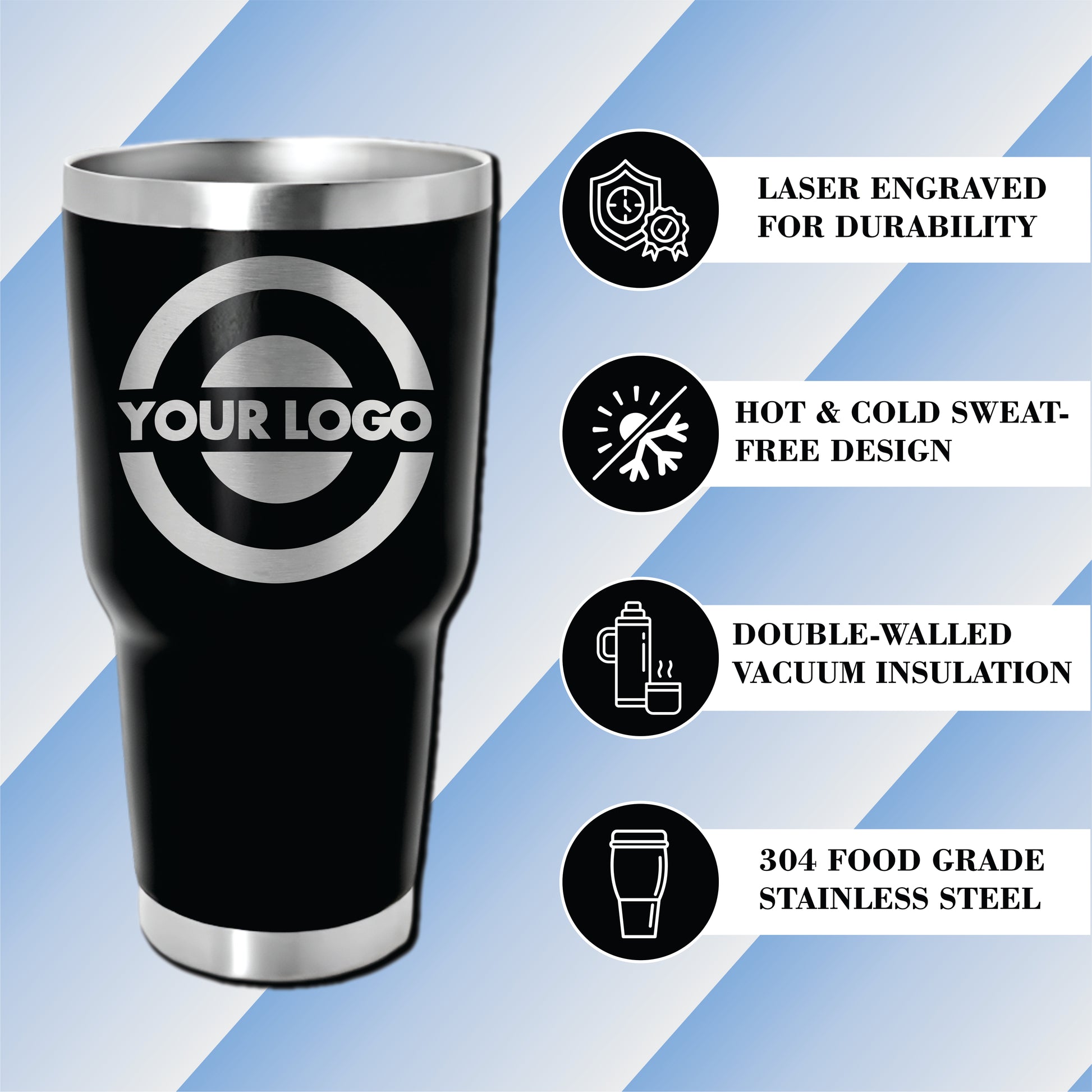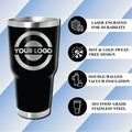 All tumblers are 304 food-grade stainless steel, double-wall vacuum insulated, and include a BPA-free clear lid. Keep drinks hot or cold for hours while promoting your business with every sip.